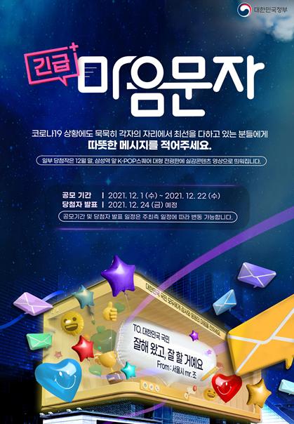 문체부는 이 캠페인을 통해 국민들이 코로나19 위기를 극복하는 데 앞장서 온 우리 이웃에게 남긴 감사와 응원의 문자를 3차원 실감형 영상으로 제작해 12월 27일부터 내년 1월 23일까지 서울 삼성역(코엑스 광장) 일대 대형 옥외전광판에 송출한다. 이 캠페인은 그동안 긴급 재난 문자에 마음 졸여 온 국민들이 잠시라도 위로받을 수 있도록 재난 소식이 아닌 ‘마음’을 전하기 위해 기획했다.