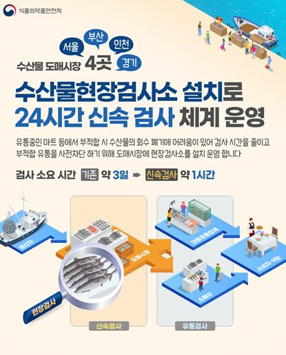 [한국쇼핑몰뉴스, 최영진기자] 식품의약품안전처는 양식 활어의 약 85%가 유통되는 서울, 부산 등의 수산물 도매시장에 수산물 현장검사소를 설치해 24시간 신속 검사체계를 운영한다.