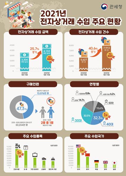 ’21년 1월부터 11월까지 전자상거래 수입 금액은 전년 동기 대비 25.7% 증가한 41억 5천만 달러로 이미 전년도 연간 실적을 넘어서 수입 금액 역대 최대치를 조기에 달성했다.