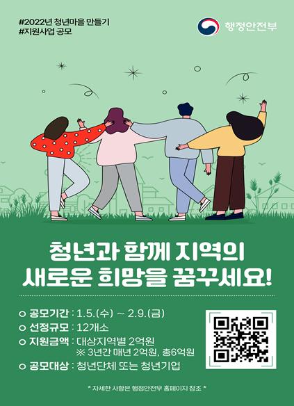 [한국쇼핑몰뉴스, 최영진기자] 행정안전부는 청년들에게는 새로운 삶의 기회를 제공하고 지역에는 활력을 불어넣는‘2022년 청년마을 만들기 지원 사업’에 참여할 청년단체를 공개 모집한다.