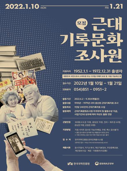 [1. 10.~21. 만 50세~70세 중장년 대상, 근대기록문화 조사원 신청 접수]