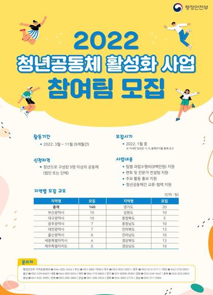 [한국쇼핑몰뉴스, 최영진기자] 행정안전부는'2022년 청년공동체 활성화 사업'에 참여할 청년공동체 140개팀을 모집한다고 밝혔다.