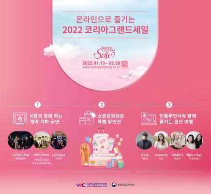 [한국쇼핑몰뉴스, 최영진기자] 문화체육관광부는 (재)한국방문위원회와 함께 1월 13일부터 2월 28일까지 외국인을 대상으로 ‘2022 코리아그랜드세일(Korea Grand Sale)’을 개최한다.