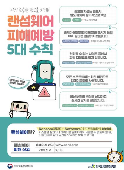 이에, 과기정통부는 금품요구악성프로그램 감염 사례 및 금품요구악성프로그램 감염 예방을 위한 대응방안을 안내하고, 개인?기업에게 주요자료 백업체계 점검 등 보안점검으로 금품요구악성프로그램 대비에 만전을 기할 것을 권고했다.