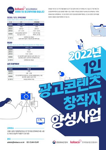 이번 사업은 정규교육 1개 과정, 특별교육 3개 과정, 광고 제작 공모전으로 구성했다. 정규교육은 광고 기획부터 촬영, 편집, 제작까지 광고의 전 과정을 배우는 실습 중심의 통합(원스톱) 교육으로서 3월부터 6월 중순까지 총 4개월간 진행하며, 광고 제작을 위한 스튜디오와 높은 사양의 촬영 및 편집 장비를 갖춘 교육시설을 제공한다. 수강생은 2월 11일부터 21일까지 48명을 모집한다. 더욱 자세한 신청 방법은 코바코 광고교육원 누리집에서 확인할 수 있다.