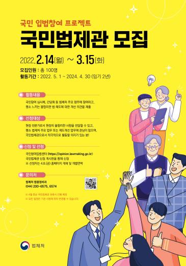 3월 15일까지 국민참여입법센터 ‘국민법제관 신청’ 게시판을 통해 신청할 수 있으며, 4월 8일 법제처 홈페이지에 선정자를 발표하고, 선정자에게는 개별 통지할 예정이다.