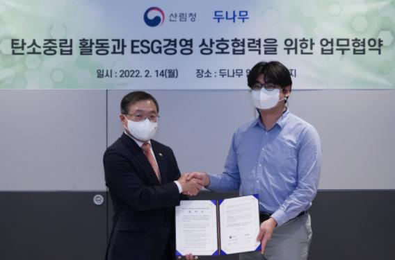[한국쇼핑몰뉴스, 최영진기자] 산림청은 2월 14일 두나무와 ‘탄소 중립 활동과 환경·사회·투명경영(ESG 경영) 상호 협력’을 위한 업무협약을 체결했다.