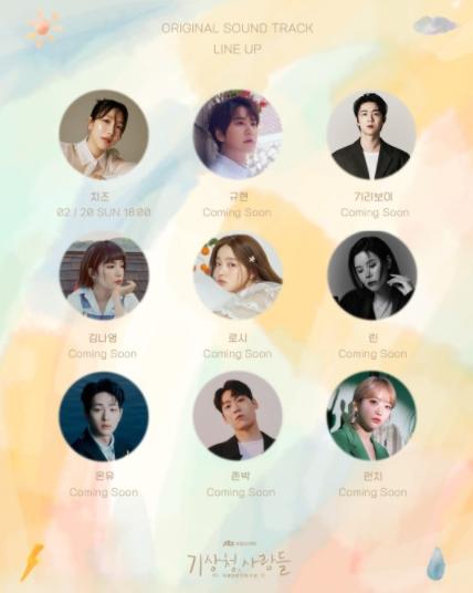 ‘기상청 사람들’ OST에는 따뜻한 음색으로 추위를 녹이는 감성 발라더 규현과 트렌디하고 감각적인 래핑으로 사랑받는 래퍼 기리보이가 참여해 음악 팬들의 뜨거운 관심을 예고했다. 또한 드라마의 몰입도를 높이는 깊은 감성의 소유자 김나영, 유니크한 음색으로 드라마에 색깔을 더하는 가수 로시 등 OST 강자로 떠오르는 뮤지션들이 출격해 완성도를 더욱 높였다.