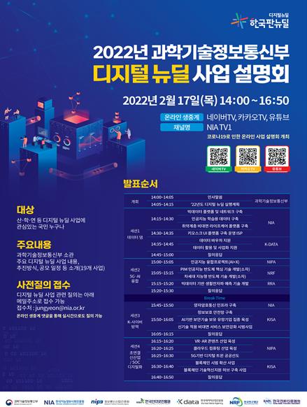 각 플랫폼에서 ‘NIA(한국지능정보진흥원) TV1’ 채널 검색 또는 사업 설명회 포스터의 QR코드를 통해 참여가 가능하며, 설명회 종료 후에도 발표 자료와 영상, 질의 내용 등은 디지털 뉴딜 누리집을 통해 확인할 수 있다.