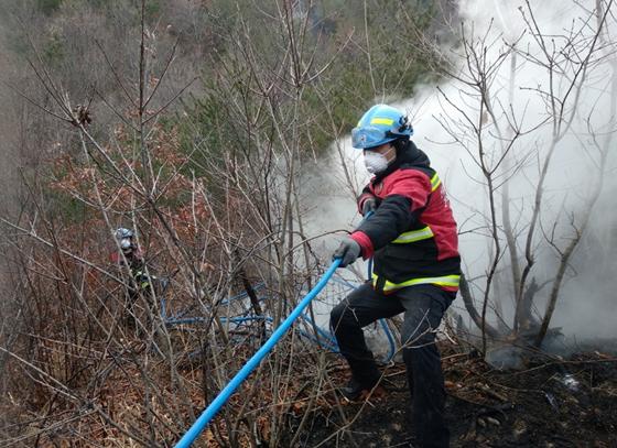 산림당국은 산불진화헬기 13대, 산불진화인력 197명(공중진화대 9, 산림공무원 150, 소방 30, 기타 8)을 긴급 투입하여 산불 진화에 나섰다.