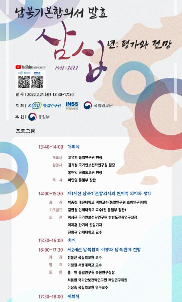 [한국쇼핑몰뉴스, 최영진기자] 국립외교원은 2022년 2월 21일 13:30~17:30에 통일부의 후원에 따라 통일연구원, 국가안보전략연구원과 함께 “남북기본합의서 발효 30년: 평가와 전망”을 주제로 남북기본합의서 발효 30주년 기념 학술회의를 개최하고 유튜브 생중계를 진행할 예정이다.