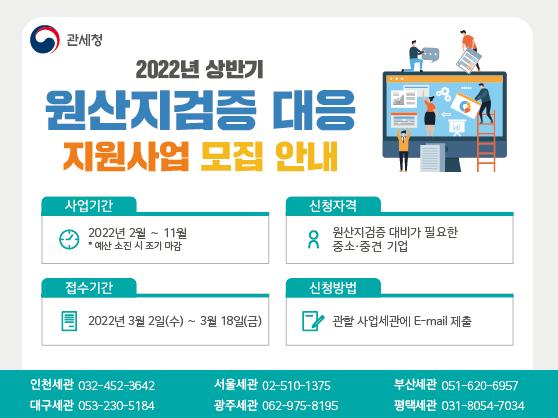 사업세관은 인천, 서울, 부산, 대구, 광주, 평택 등 6개 세관으로 상호출자 제한 기업집단(대기업)에 속하지 않는 중소·중견기업에 최대 200만원까지 지원되며, 특히 올해는 전년 대비 40%가 증액된 약 6억원의 예산이 투입되어 원산지검증 대비가 필요한 기업을 더 폭넓게 지원할 예정이다.