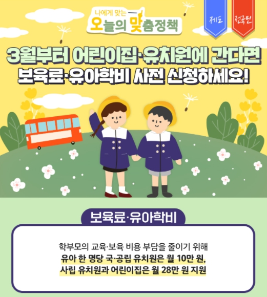 학부모의 교육·보육 비용 부담을 줄이기 위해 유아 한 명당 국·공립 유치원은 월 10만 원, 사립 유치원과 어린이집은 월 28만 원을 지원합니다.