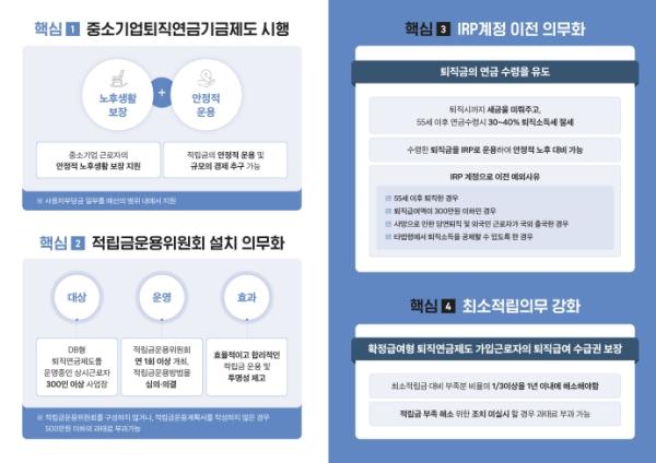 중소기업(30인 이하) 사용자가 납입한 부담금으로 공동의 기금을 조성하여 근로자에게 퇴직급여를 지급하는 ‘중소기업퇴직연금기금제도’(‘중소퇴직기금제도’)가 도입된다.