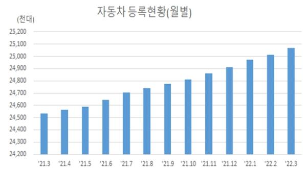 [한국쇼핑몰뉴스, 최영진기자] 국토교통부는 ‘22년 1분기 자동차 누적등록 대수는 25,070천대로 전 분기 대비 0.6%(159천대) 증가하였으며, 인구 2.06명당 1대의 자동차를 보유하였다고 밝혔다.
