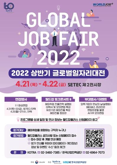 [한국쇼핑몰뉴스, 최영진기자] 고용노동부와 대한무역투자진흥공사(사장 유정열), 한국산업인력공단(이사장 어수봉)은 4월 21일부터 4월 22일까지 2일간 서울 세텍(SETEC) 제2전시관에서 2022 상반기 "글로벌 일자리 대전"을 개최한다.