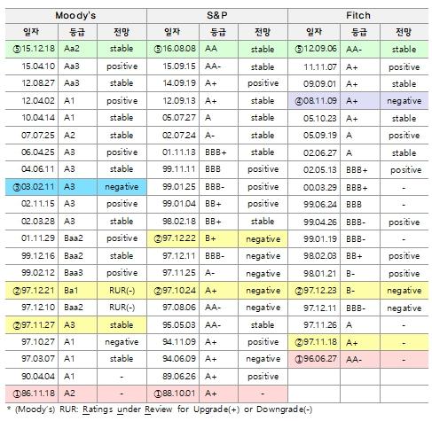 한국의 신용등급 상향요인은 잠재성장 제고 및 고령화 극복을 위한 경제?구조개혁, 한반도 전쟁 위협 감소 등 지정학적 리스크 완화이며, 대내외 충격에 따른 잠재성장의 구조적 훼손, 정부재정의 중대한 악화, 지정학적 리스크 고조는 하향요인이다.