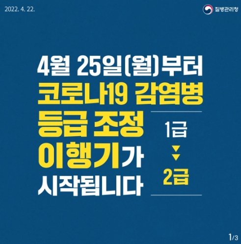 [한국쇼핑몰뉴스, 최영진기자] 4월 25일(월)부터 코로나19 감염병 등급이 1급에서 2급으로 조정 이행기가 시작됩니다.