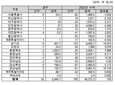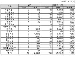 금주 집행예정인 52건 중 30건은 지역제한 입찰 또는 지역의무 공동도급 대상공사로, 965억 원 상당(33%)을 지역업체가 수주할 수 있을 것으로 예상된다.