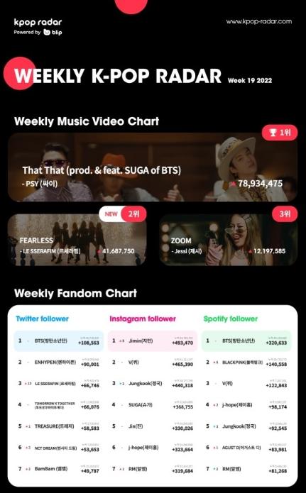 싸이의 ‘That That’ 뮤직비디오는 케이팝레이더 19주차 집계 기간 (2022년 5월 1일 ~ 2022년 5월 7일) 동안 무려 7,893만 뷰를 기록하며 지난 주에 이어 다시 정상에 올랐다.