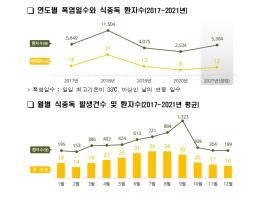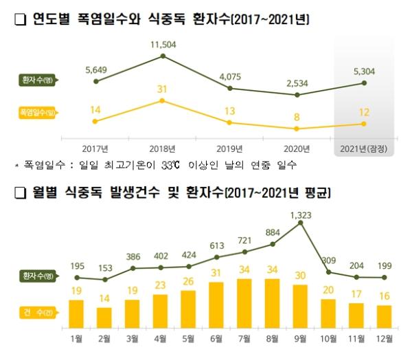 식중독 발생은 기온와 밀접한 관련이 있는데 기온이 평균 1℃ 상승 시 식중독 발생건수는 5.3%, 환자수는 6.2% 증가한다는 연구결과가 있으며, 실제로 폭염일수가 31일로 가장 많았던 2018년에 식중독 발생(222건, 1만 1,504명)이 가장 많았다.