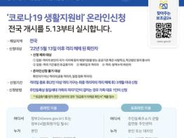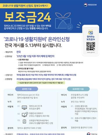 행정안전부와 질병관리청은 5월 13일부터 정부24 누리집 또는 모바일앱을 통해 코로나19 확진자에 대한 ‘생활지원비 신청 온라인 서비스’를 개시한다고 밝혔다.