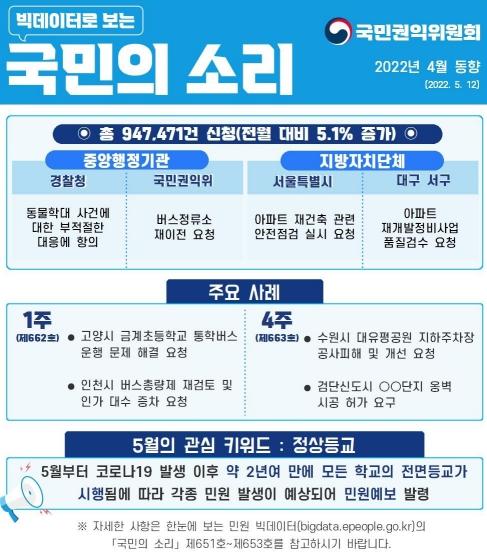 한편, 국민권익위는 지난 한 달 동안 민원분석시스템을 통해 수집된 2022년 4월 민원 빅데이터 동향도 발표했다.