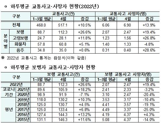 이러한 경향은 특히 보행 교통사고 분야에서 더욱 두드러졌다. 코로나 이전 4월의 보행 교통사고는 1분기에 비해 증가하지만, 사망자는 감소하는 경향을 보였는데 올해 보행 교통사고는 1~3월 대비 4월 26.6% 증가하여 크게 늘었고 하루평균 사망자도 19.4% 증가하는 등 모두 전체 교통사고의 증가 폭을 상회하는 것으로 나타났다.