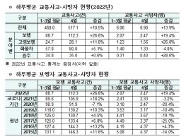 코로나 이전 5년(2015~2019년, 이하 ‘코로나 이전’) 4월은 대체로 1~3월보다 교통사고는 크게 증가하는 반면 사망자는 비교적 소폭 증가하는 추세를 보였는데 올해는 교통사고(+10.5%)보다 사망자(+13.9%)가 더욱 큰 폭으로 증가하여 거리두기 해제에 따른 교통사고 및 사망자 증가에 영향을 미친 것으로 나타났다.
