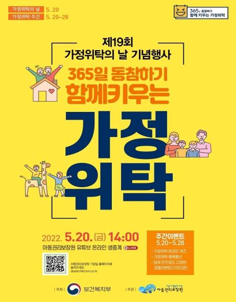 [한국쇼핑몰뉴스, 최영진기자] 보건복지부는 '제19회 가정위탁의 날'을 맞아 아동권리보장원(원장 윤혜미)과 함께 5월 20일 오후 2시 기념식을 개최한다고 밝혔다.