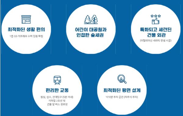 넷째, 어린이대공원과 인접한 숲세권으로 멀리 가지 않아도 대자연을 느낄 수 있다. 도심에서 누리는 녹지 프리미엄과 자연이 주는 힐링을 경험할 수 있는 최적의 입지 조건을 갖추고 있다.