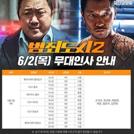 지난 3년 간 한국영화의 모든 흥행 신기록을 새로 쓴 영화 '범죄도시2'는 관객들의 성원에 보답하기 위해, 극장으로 직접 발로 뛰며 감사 인사를 전할 예정이다.