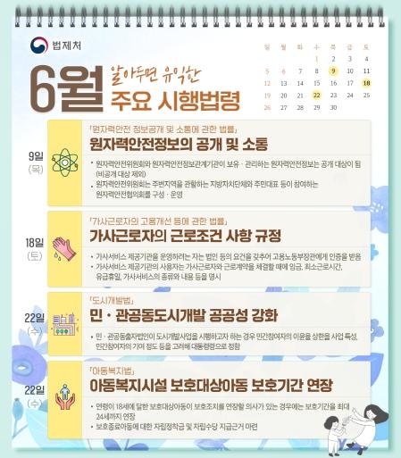 [한국쇼핑몰뉴스, 최영진기자] 법제처는 6월에 총 116개의 법령이 새로 시행된다고 밝혔다. 주요 시행법령의 내용과 시행일은 다음과 같다.