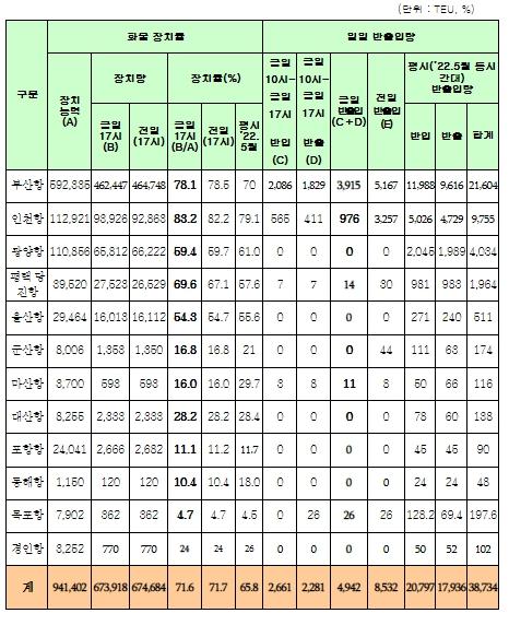 항만 등 주요 물류기지 장치율(71.6%)은 평시(65.8%) 수준이나, 부산항, 울산항 등 일부 항만에서 국지적으로 운송방해행위가 있어 평시보다 반출입량은 감소했다.