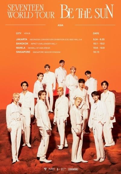 공개된 포스터에 따르면, 세븐틴의 '비 더 선(BE THE SUN)' 아시아 투어는 오는 9월 24~25일 자카르타, 10월 1~2일 방콕, 8~9일 마닐라, 13일 싱가포르까지 아시아 4개 도시, 총 7회에 걸쳐 진행된다.