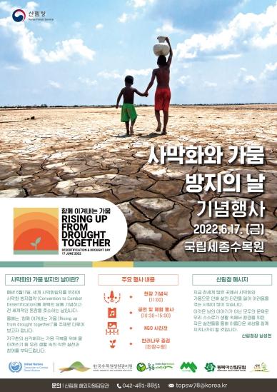 2022년 사막화와 가뭄 방지의 날 행사는 해외에서 사막화 방지 활동을 하고 있는 푸른아시아, 동북아산림포럼, 미래숲, 인천 희망의 숲이 참여하여 체험 공간(부스) 운영, 공연 등을 진행하며, 일반 국민이 많이 참여할 수 있도록 한국수목원정원관리원과 국립세종수목원에서 홍보 및 안내 등을 협조할 예정이다.
