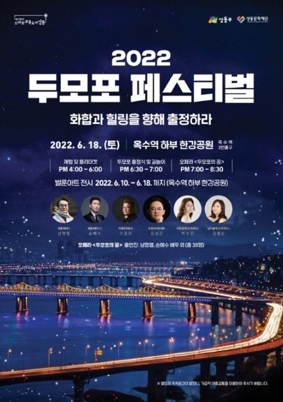 성동구가 주최하고 성동문화재단이 주관하는 위 축제는 2019년 제1회 두모포 페스티벌로 시작했으며 코로나19로 인한 공백기를 딛고 재부활한다.‘화합과 힐링을 향해 출정하라’의 주제로 열리는 이번 축제는‘두모포 출정’의 감동을 재현한다.
