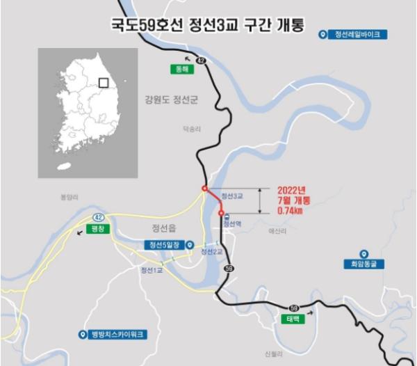 해당 공사는 정선읍 애산리부터 덕송리까지 2차로(연장 0.74㎞, 폭 11.5m) 신설 사업으로, 교량 1개소(정선3교, 450m)와 정선역 간 연결도로(290m)에 대하여 총사업비 311억원을 투입하여 ’18년 3월 착공한 지 4년 4개월 만에 마무리하게 되었다.