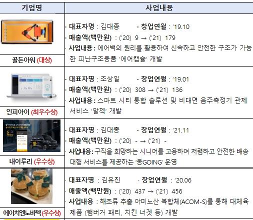 에어백의 원리를 활용해 신속하고 안전한 구조가 가능한 피난 구조용품 ‘에어캡슐’을 개발한 골든아워가 대상(중소벤처기업부 장관상 및 상금 500만원)을, 비대면 음주측정 관제 서비스 ’알첵‘을 개발한 인피아이가 최우수상(중소벤처기업부 장관상 및 상금 300만원)을 수상했다.