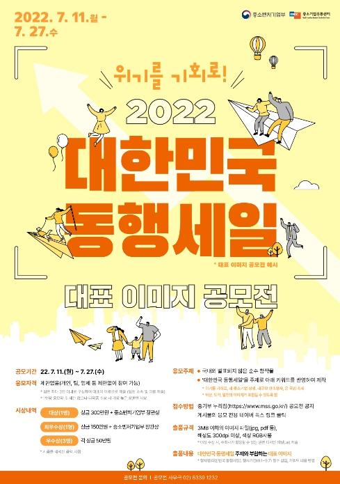 [한국쇼핑몰뉴스, 최영진기자] 중소벤처기업부는 전 국민을 대상으로 7월 11일(월)부터 7월 27일(수)까지 ‘2022 대한민국 동행세일 대표 이미지 공모전’ 접수를 받는다고 밝혔다.