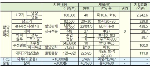 소·닭·돼지고기 등 생활물가 체감도가 높은 품목에 할당관세를 적용하여 민생부담을 완화하고 서민생활 안정을 지원한다.(관세 지원효과: 약 3,290억원)