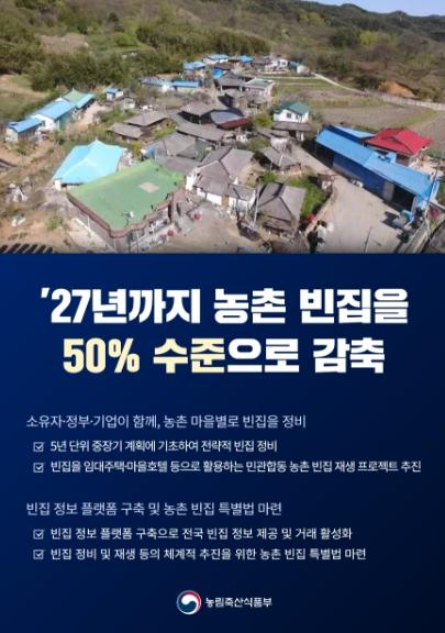 이번 대책은 농촌에 방치된 빈집으로 인해 발생하는 환경·위생·안전 등 사회문제 해소를 위해 빈집정비를 활성화하기 위한 방안을 정한 것으로, 대책의 이행을 통해 2027년까지 현재 농촌 빈집의 절반 수준으로 빈집을 감축하여, 쾌적하고 지속 가능한 농촌 주거공간을 조성하는 것을 목표로 한다.