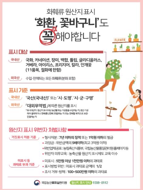 화훼류 중 원산지를 의무적으로 표시해야 하는 품목은 국산 절화류 11개 품목과 수입·판매되는 모든 외국산 화훼류이다.