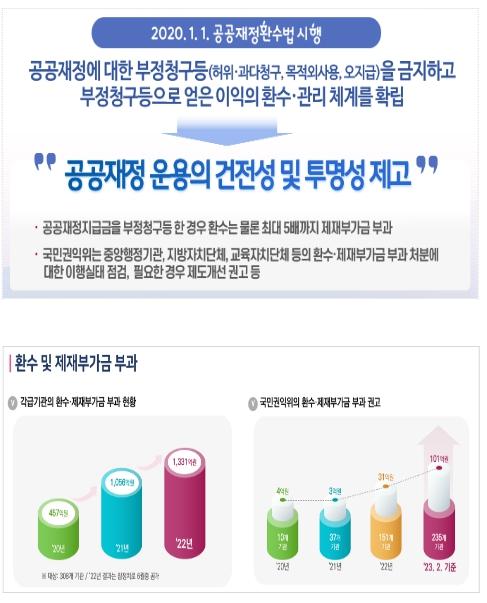 국민권익위는 공공재정환수관리과를 통해 229조 원(2022년 기준)에 달하는 공공재정지급금 부정수급 행위에 대한 신고사건 처리와 공공재정환수법에 따른 환수·제재부가금 부과 처분 확인, 취약분야 실태조사·제도개선이 더욱 유기적으로 추진될 것으로 기대하고 있다.
