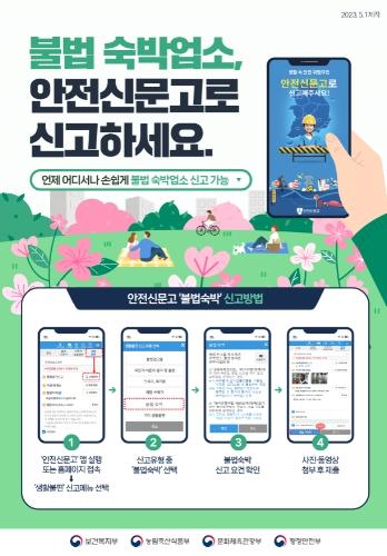 이를 해결하기 위해 관련 부처 협업으로 행정안전부에서 운영 중인 안전신문고에 ‘불법숙박’ 메뉴를 추가하여 전담 신고창구를 신설했다.