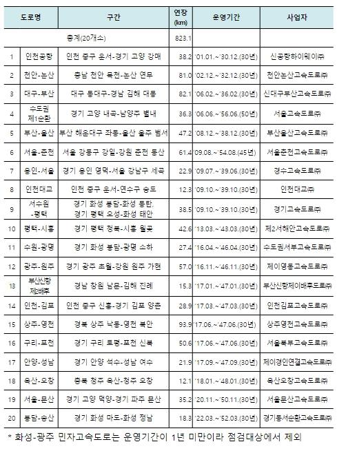 먼저, 대구-부산을 시작으로 수도권 제1순환(일산-퇴계원), 상주-영천, 안양-성남 4개 민자고속도로 뿐 아니라, 12월 말 개통 예정인 포천-화도 민자고속도로에 대해서도 합동점검을 실시할 예정이다.