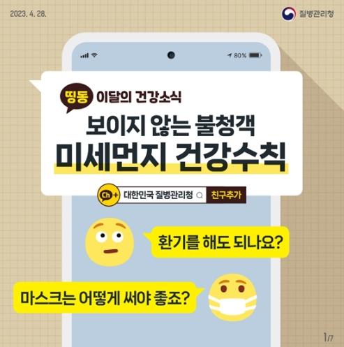 미세먼지 건강수칙에 대한 더 자세한 내용은 질병관리청 누리집에서, 매달 새로운 건강 지식을 알려주는 이달의 건강소식은, 카카오톡 채널 ‘대한민국 질병관리청’을 추가하고 메시지로 받아보세요!