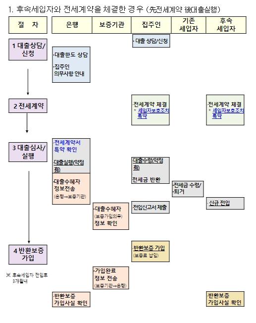 또한, 집주인의 선순위 대출 확대로 인해 후속 세입자의 전세금 미반환 위험이 확대되지 않도록, 집주인이 후속 세입자 보호조치를 취하는 것을 전제로 대출규제 완화혜택을 지원할 예정이다. 규제완화를 적용받기 원하는 집주인은 우선 후속 세입자와 “전세금 반환보증 가입”을 특약으로 하는 임대차계약을 체결해야 하며, 은행은 동 임대차계약서(특약)이 성실히 이행된다는 전제하에 대출을 지원한다. 집주인은 후속 세입자가 입주한 후 3개월 이내에 전세금 반환보증 가입 또는 보증료를 납입해야 하며 이러한 의무가 이행되지 않는 경우 대출금 전액 회수 등 제재조치가 이뤄질 수 있다.