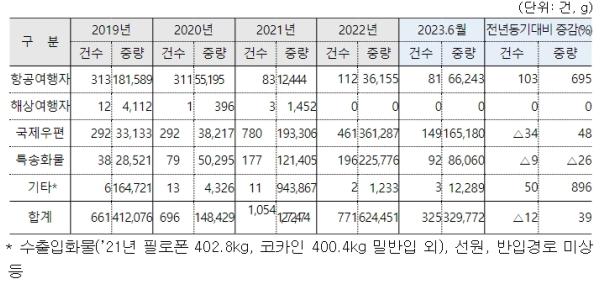 고광효 관세청장은 상반기 마약밀수 단속 동향을 발표하면서 “최근 하루 평균 2건, 2kg에 가까운 마약밀수 시도가 적발되고 있어 국민의 일상을 위협하고 있다”면서 지난 2월 발표한'마약밀수 단속 종합대책'을 차질 없이 추진하는 등 앞으로도 관세행정의 최우선 순위를 마약으로부터 국민을 보호하는 데 두겠다”고 밝혔다.