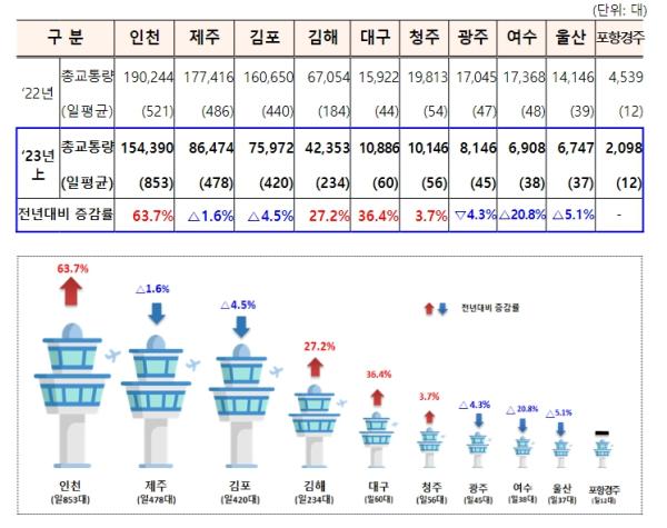 '23년 상반기 항공교통량 집계 결과… 전년 대비 31% · 국제선 70%↑